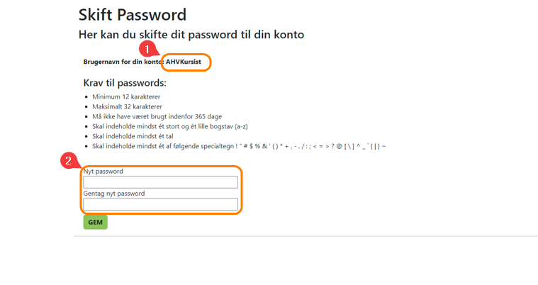 2. Her skriver du dit nye password (Husk ad følge alle grænsene)