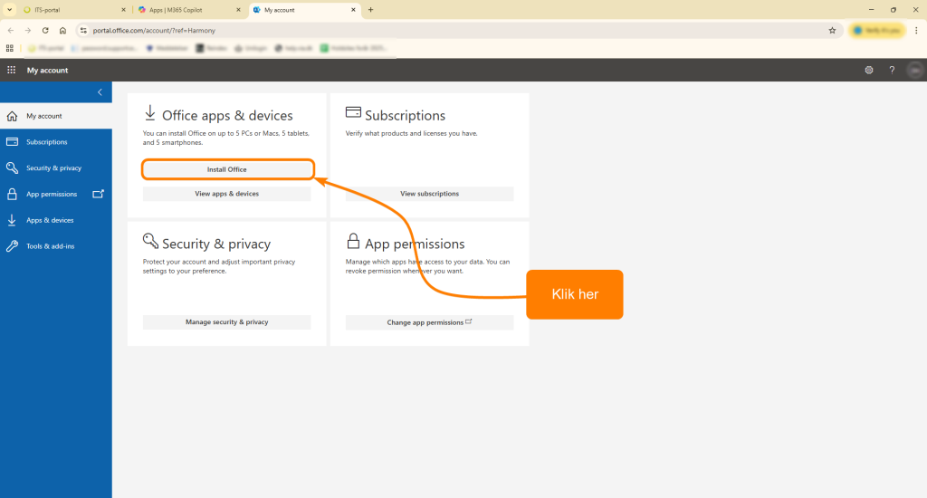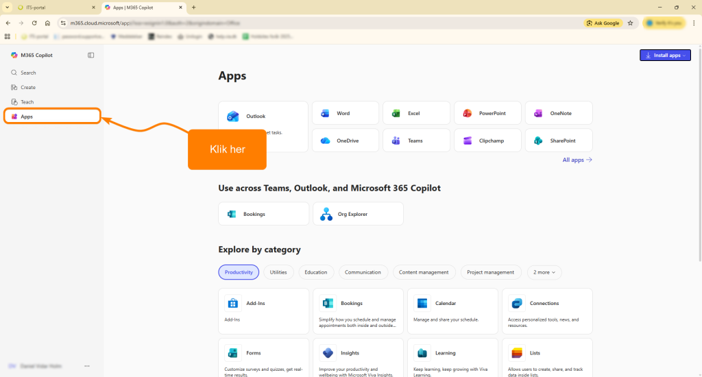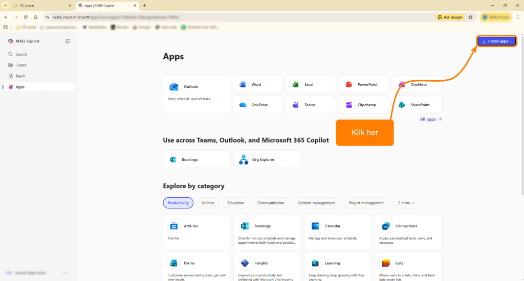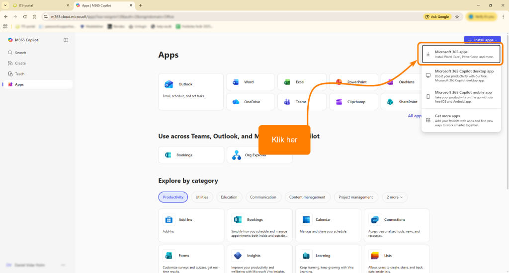 - Træk på “Microsoft 365 apps” i dropdown menuen